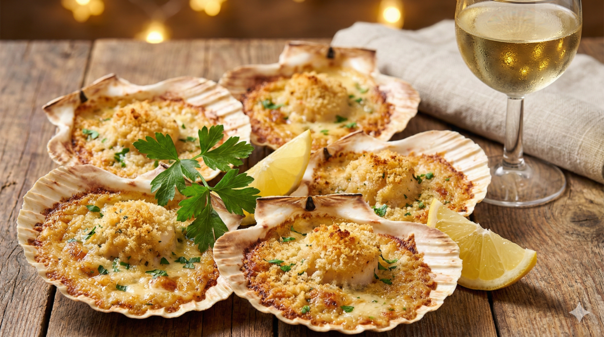 Des coquilles Saint-Jacques gratinées au beurre noisette, dorées et prêtes en 30 minutes