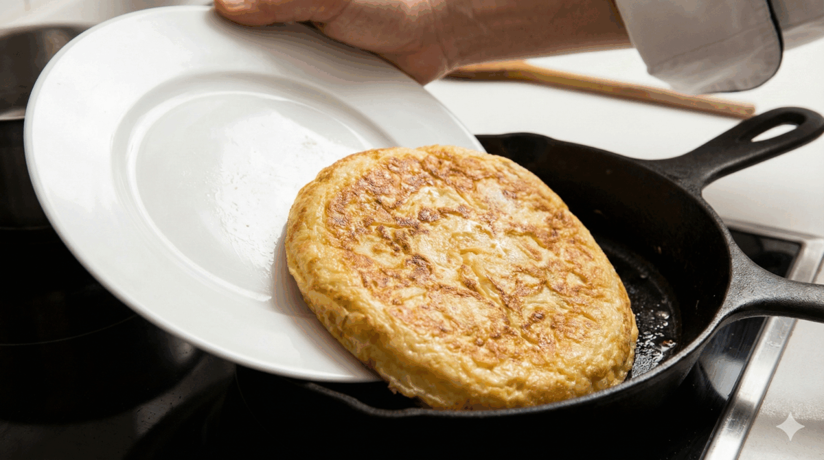 Quand le dessous vous paraît bien cuit, vous prenez un grand couvercle plat ou une grande assiette. Vous la posez sur la poêle. Vous maintenez fermement. Puis vous retournez d’un geste franc pour faire glisser la tortilla sur le couvercle.
