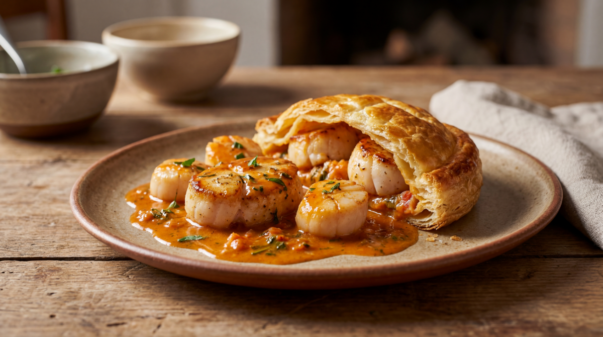 Il s’agit d’un plat de fête à base de lotte en médaillons et de noix de Saint-Jacques, nappés d’une sauce armoricaine tomatée, parfumée au vin blanc, fumet de poisson, cognac et crème. Le résultat est un plat iodé, chic et très parfumé, idéal pour un dîner un peu formel à la maison.