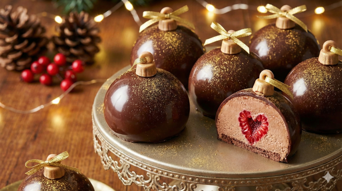 Boules de Noël chocolat–framboise : biscuit moelleux, mousse légère… et cœur surprise qui fait wow