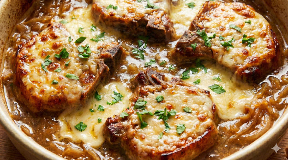 Ces côtelettes de porc arrivent avec une couche d’oignons bien chaude et un gruyère doré. À la découpe, le fromage file un peu, puis la viande reste juteuse.